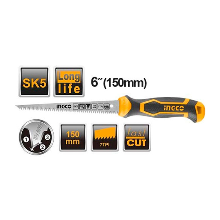 سایر مشخصات: جنس تیغه از فولاد SK5 قابلیت برش سریع (Fast Cut) عمر طولانی (Long Life) تحت تکنولوژی آمریکا دارای تیغه های 8TPI سایز 6 اینچی / 150 میلی متر دارای سوراخ آویز در بالای دسته دسته TPR ضد لغزش و ضد تعریق سِری صنعتی اینکو