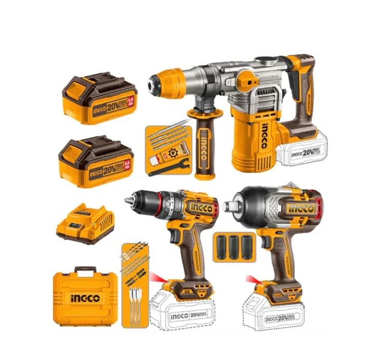 اقلام همراه: ٢عدد باتری ۵آمپر.شارژر فست. ست مته و قلم. ست سه عددی بکس فشار قوی درایو٣/۴ در یایز های:١٧-١٩-٢١
