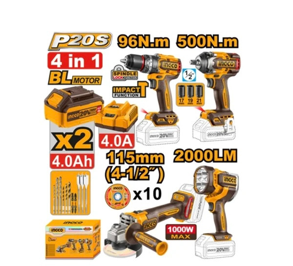 ست کمبو 4 عددی شارژی اینکو مدل COSLI241292 یک مجموعه کامل و قدرتمند از ابزارهای شارژی است که برای کاربران حرفهای و نیمهحرفهای طراحی شده است. این ست با بهرهگیری از فناوری موتورهای براشلس (بدون ذغال) و ولتاژ 20 ولت (نه 24 ولت)، کارایی بالا، دوام طولانی و عملکردی قابل اعتماد را در انواع پروژههای صنعتی، ساختمانی و خانگی ارائه میدهد.
