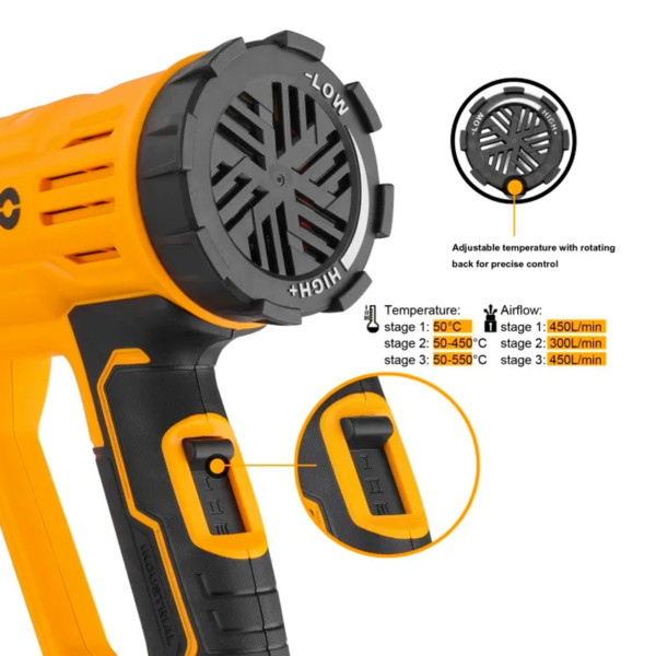سشوار صنعتی 2000 وات اینکو مدل HG200047 یک ابزار کاربردی برای مصارف صنعتی و خانگی است. این سشوار از توان خروجی 2000 وات برخوردار است و میتواند جریان هوای داغی با دمای 450 تا 550 درجه سانتیگراد تولید کند. سشوار صنعتی اینکو دارای سه حالت تنظیم دما و جریان هوا است که امکان استفاده از آن را برای طیف گستردهای از کاربردها فراهم میکند.6941640180315